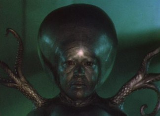 In contrast to the Mu-tants, the Supreme Martian Intelligence is more startling in appearance. It appears to be a tentacled head encased in some sort of fish bowl. It communicates to its Mu-tant lackeys through telepathy and is truly a disturbing image, especially as its eyes dart back and forth. In reality, the Supreme Intelligence is played by little person actor, Luce Potter, who you may know as Violet from Jack Arnold’s classic, The Incredible Shrinking Man.